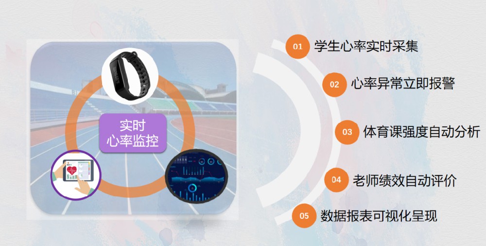 协助学校随时掌握体育课密度,评判体育课质量优劣,全面提升体育教学质量。对学生心率实时采集,出现心率异常情况立即报警,对体育课强度自动分析,老师绩效自动评价,课堂数据报表可视化呈现,对课堂效果实现智能监控。