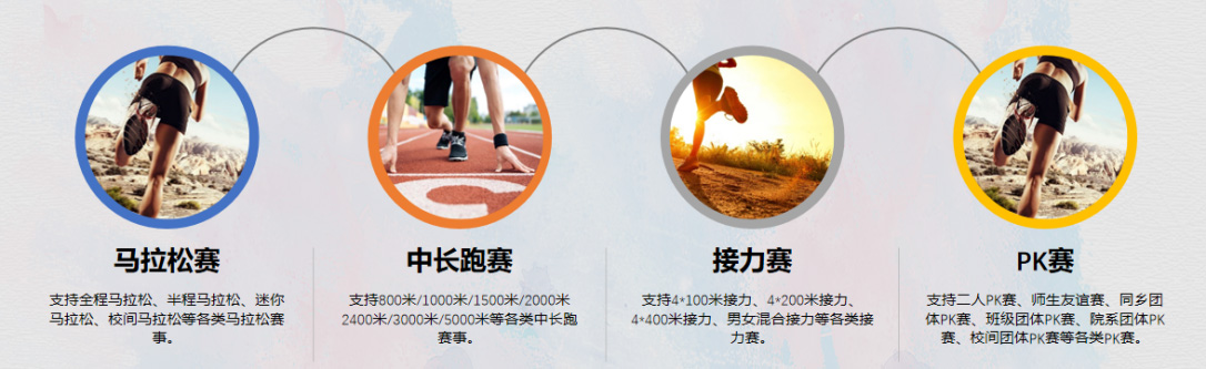 协助学校实现体育赛事智能筹办,无论是马拉松赛、中长跑赛、接力赛、PK赛都能轻松筹办,可实现体育赛事数据自动采集,比赛成绩自动计算,比赛结果自动公布。学校体育老师可在管理后台举办院校级体育赛事,学生可在手机端随时筹办小型比赛。