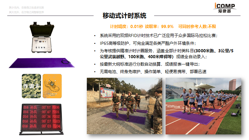 4月13日、14日、15日,连续三日中部战区某部的考场上,由我司协助的军事院校招生军事共同科目三公里考试课目顺利完成。我们利用自主研发的双频无源RFID计时系统,快速、准确地记录30多组考生考核成绩。本次考试协助工作中设备运行稳定、计时精准、全方位专业而周到的服务,得到考核组的一致好评。