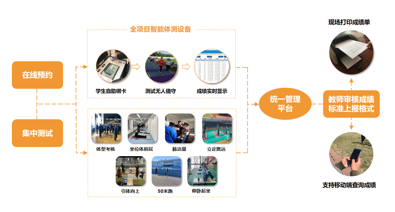 整套智能化的学生体测硬件设备,智能化云端管理平台,实现智能、高效的体质健康测试。学生体测数据智能采集、自动计算成绩、耐力跑测试不限测试人数,数据实时同步管理端,一周完成全校体测任务,一键形成报表汇总给学校管理者或教育部。