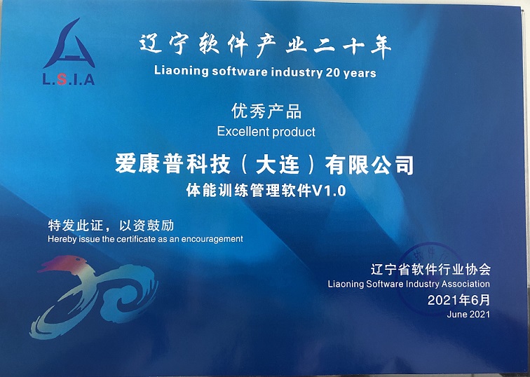 我司“爱康普体能训练管理软件V1.0”荣获“辽宁省优秀软件产品”称号