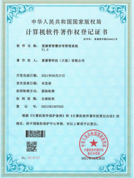 近日,由我公司自主研发的“爱康普智慧训考管理系统V1.0 ” ,“爱康普智慧训考系统V1.0”,“爱康普智慧训考展示系统V1.0”,荣获中华人民共和国国家版权局计算机软件著作权。截止至今,爱康普已获得50项计算机软件著作权及专利权。